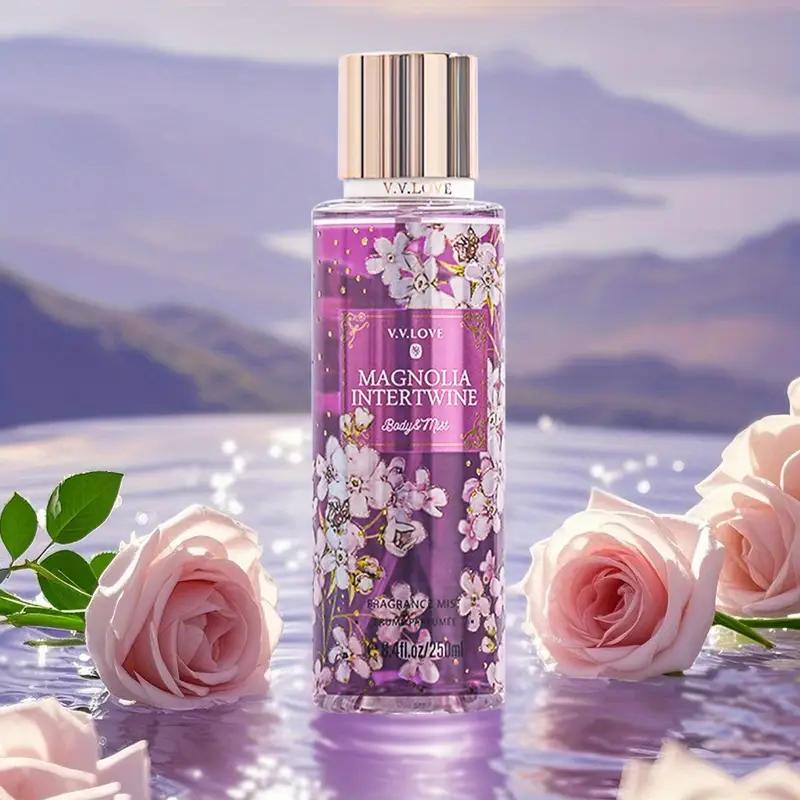 *Fragrance de corp V.V Love – Magnolia Intertwine* - Un body mist elegant și delicat, cu note florale rafinate de magnolie. Perfect pentru momentele în care vrei să emani feminitate și grație, adăugând o notă subtilă de prospețime și rafinament.